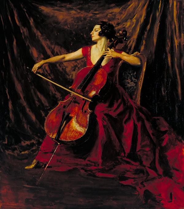 今日的人們大都是通過一幅著名的油畫作品去認識這位二十世紀上半葉的大提琴女神的,它的作者是奧古斯都·約翰(Augustus John)。作者準確而傳神地捕捉到了蘇吉婭在演奏的一瞬間她沉醉而迷人的姿態(tài),進而揭示出人物內(nèi)心奔放不羈的個性特征。作品極具藝術(shù)張力,給觀賞者產(chǎn)生了強烈的視覺震撼。